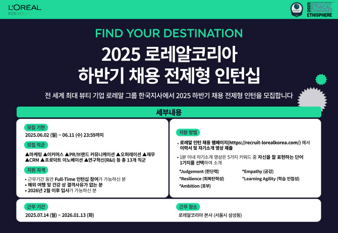 정효주 로레알코리아 인사 부문장은 “로레알코리아는 인턴십을 통해 현재까지 글로벌 뷰티 산업에서 활약하고 있는 수많은 인재들을 발굴해 왔다”라며 “인턴십 프로그램은 로레알 그룹이 청년 인재를 채용하는 중요한 수단으로, 인턴십 종료 후에는 평가에 따라 정직원 전환의 기회도 주어지니, 로레알과 함께 커리어 개발을 위한 의미 있는 경험을 통해 글로벌 시장을 무대로 성장하고자 하는 인재들의 많은 참여를 바란다”고 전했다.