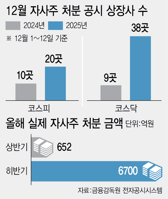 코스닥에선 에스넷(038680)이 2억 748만원 상당의 자사주를 지난 4일 처분해 직원 상여금으로 지급했다. 예스티(122640)의 경우 자사주를 담보로 약 154억원 규모의 교환사채를 지난 12일 발행했다고 했다. 처분주식 수는 보통주 약 77만주이며 시설 및 운영자금 조달이 목적이다. 아직 이달 중순임을 고려하면 증가세가 높다고 볼 수 있다. 지난달(11월) 한 달 동안에는 57곳이 자사주를 처분하겠다고 공시했다. 전년 동기(2024년 12월 1~12일)엔 불과 19곳에 그쳤다.