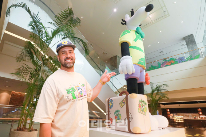 [이데일리 한전진 기자]현대백화점 판교점이 오는 8월 말까지 진행하는 ‘후이 후이 마우이’ 여름 테마 행사 기간에 글로벌 팝 아티스트 스티븐 해링턴과 함께 작업한 하와이 콘셉트의 연출을 선보인다고 29일 밝혔다. 사진은 이날 판교점에서 스티븐 해링턴이 하와이 바캉스를 콘셉트로 제작한 초대형 강아지 캐릭터 ‘멜로’를 소개하는 모습.