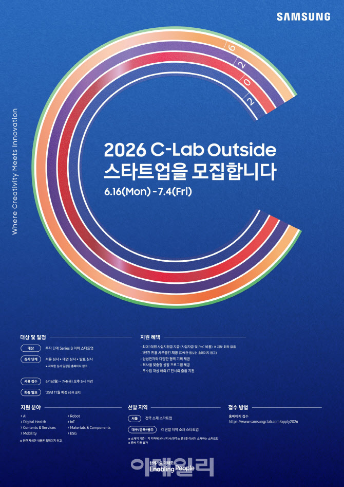 모집 분야는 △인공지능(AI) △로봇 △디지털헬스 △사물인터넷(IoT) △콘텐츠&서비스 △소재·부품 △모빌리티 △ESG 등이다. 국내에 법인이 등록되어 있고, 시리즈B 이하 투자를 받은 스타트업이라면 ‘삼성 C랩 홈페이지’에서 지원할 수 있다.