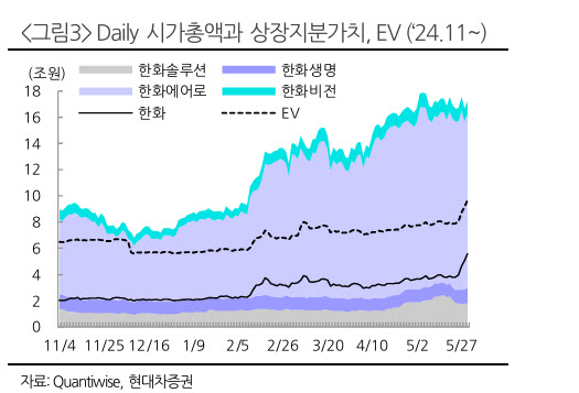 목표가 상향은 기존 목표 순자산가치(NAV) 할인율을 74%에서 63%로 낮춘 데 따른 것이다. 한화의 현 순자산가치(NAV)는 16조원, 유동주식수 기준 주당 NAV에 목표 할인율 63%를 적용해 목표주가를 산출했다. 현재 NAV 할인율은 65.1%까지 축소된 상태다.