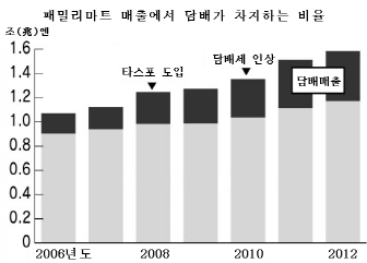 일본 매출 3위 편의점 패밀리마트의 매출 추이를 살펴보면 담배가격이 인상되기 이전인 2007년 회계연도(2007년 3월~2008년 2월) 패밀리마트 전체 매출 1조1218억엔 중 담배가 차지하는 비중은 약 16%로 1809억엔을 기록했다.