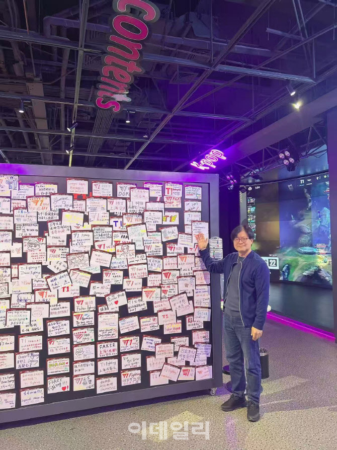 또 멤버별로 사인이 적힌 티셔츠, 유니폼과 캐릭터 굿즈들로 구성된 전시 부스가 관람객들을 맞이했다. 안쪽에는 팬들이 T1에 응원 메시지를 써서 붙일 수 있는 공간이 마련됐는데 중국어로 T1의 우승을 바란다는 메모지가 차곡차곡 붙어있었다.