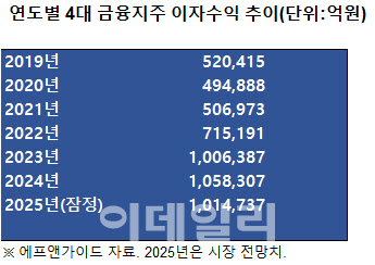7일 연합뉴스가 금융정보업체 에프앤가이드에 의뢰해 분석한 결과에 따르면 올해 4대 금융지주(KB·신한·하나·우리)의 연간 이자수익 시장 전망치는 총 101조4737억원으로, 지난해 105조8307억원 대비 약 4% 감소하는 것으로 나타났다. 이는 금융회사가 대출과 자금 운용을 통해 벌어들이는 이자 수입을 합산한 것으로, 일반 기업의 매출에 해당하는 핵심 지표다. 4대 금융지주 이자수익이 감소하는 것은 코로나19 팬데믹 당시인 2020년 이후 5년 만에 처음이다.