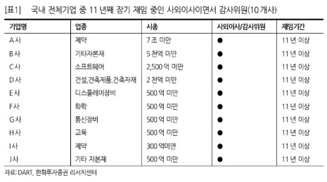 보고서에 따르면 코스피 816개사와 코스닥 1716개사를 대상으로 이사회 구성원 3만 9054명의 재임 기간을 분석한 결과, 사외이사와 감사가 7년을 초과해 8년 이상 장기 재임 중인 기업은 105개사로 집계됐다. 이들 기업에서 장기 재임 중인 이사는 총 121명이며 평균 근속연수는 8.32년이었다. 일부 기업에선 사외이사가 최장 11년째 재임 중인 사례도 확인됐다.