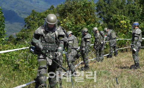 | | 육군 5사단(열쇠부대) 장병들이 지뢰탐지 및 제거작업을 벌이고 있다. (사진=이데일리DB) |