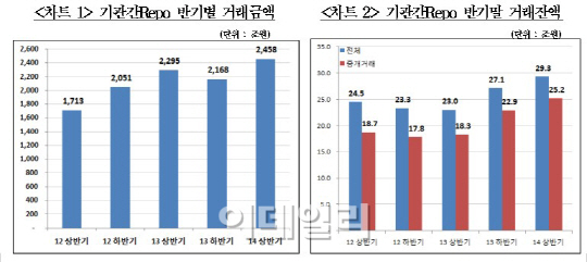 한국예탁결제원은 상반기 기관간 Repo 거래금액이 2458조원을 기록, 전년동기대비 7.1% 증가했다고 23일 밝혔다. 시장 규모를 가늠할 수 있는 Repo 거래잔액도 상반기 말 기준 29조3000억원에 달해 전년동기 보다 27.4% 늘었다.