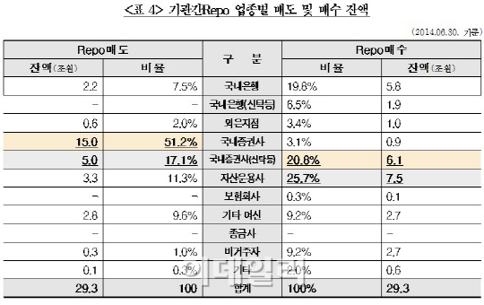 거래 참가 업종별로는 국내증권사, 국내증권사 신탁, 자산운용사가 큰 비중을 차지했다. 그 중 가장 활발한 Repo업무 참가 업종은 증권회사다. 국내 증권사들은 지난 상반기 말 기준 채권을 Repo매도해 15조원의 자금을 조달했다.