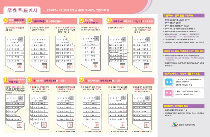 특히 “선거관리위원회에서 전국 각 투표소에 비치한 기표용구는 투표용지에 기표 후 바로 투표지를 접었을 때 묻어나지 않도록 순간 건조되는 특수 유성잉크를 사용하고 있다”며 “선거인이 기표용구를 힘주어 투표용지에 기표하는 경우 번지는 현상이 있을 수 있으나 그 것으로 무효표가 되는 것은 아니다”고 거듭 강조했다.