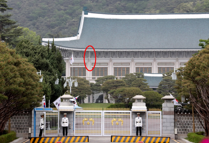 | | 제19대 대통령선거 투표인 9일 청와대 본관 앞에 게양된 태극기 옆의 깃봉(붉은 원안)이 비어 있다. 이 깃봉에는 대통령이 청와대에 있을 때 게양되는데 지난 3월 10일 헌법재판소가 박근혜 전 대통령을 탄핵해 봉황기가 내려졌다. 새로운 대통령이 선출돼 청와대에 입성하며 봉황기가 게양된다. (사진=연합뉴스) |