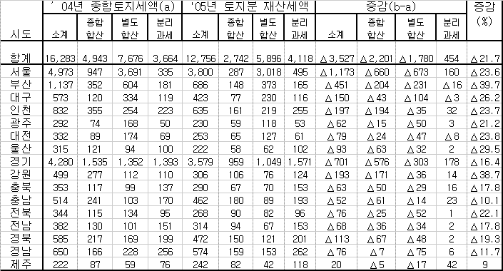 또한 그동안 누진세율로 적용해 전국 합산 과세하던 종합토지세를 재산세와 종합부동산세로 이원화했기 때문이라고 덧붙였다.