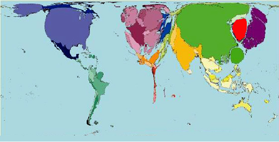 영국 셰필드대학 `사회·공간 불평등 연구그룹`(SASI)과 미시간대 마크 뉴먼 교수는 2015년을 가상한 '세계 경제력 지도(아래)'를 제작해 24일(현지시간) 발표했다.