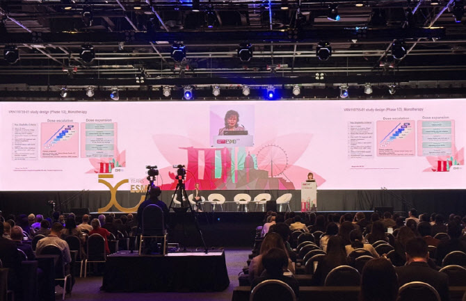 ESMO Asia Congress 2025에서 VRN11 임상1상 데이터를 발표하는 안명주 교수 사진. (사진=보로노이)