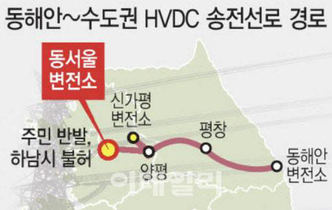 [이데일리 최훈길 기자] 정부가 ‘에너지 고속도로’(전력망 건설 국책사업) 국정과제 0순위 사업인 동서울변전소 증설(하남 변환소 신설)을 두고 입지 재검토에 착수, 대체 부지 방안을 검토한다. 주민들이 반발하고 있는 초고압설비인 변환소 입지를 하남시 주거밀집지역이 아니라 팔당댐 인근에 설치하는 대안을 살펴보기로 한 것이다.