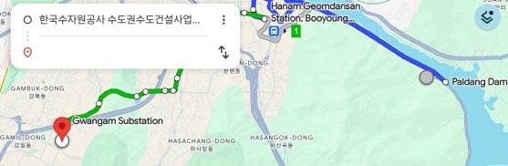 | | 동서울변전소가 위치한 경기도 하남시 감일동(왼쪽 붉은색)은 주거밀집지역인 반면 한국수자원공사 수도권 수도건설사업단(오른쪽 파란색 부분)은 대부분 산림으로 구성돼 있어 대체 부지로 거론되고 있다. (사진=구글) |