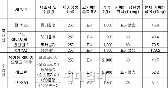 한편, 녹색식품연구소는 최근 섭취가 증가하고 있는 에너지음료 7종을 대상으로 실제 카페인 함유량을 분석했다. 이번 조사결과 7개 제품 모두 고카페인 음료에 해당했으며, 이중 삼성제약 야(YA)에는 타 제품에 비해 카페인 함량이 최대 2.9배 많은 138.2㎎이 들어있는 것으로 나타났다.