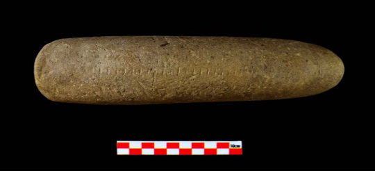 16일 한국선사문화연구원에 따르면 눈금이 새겨진 돌은 충북 단양군 적성면 하진리 남한강 인근에서 시행하고 있는 후기 구석기 유적을 발굴조사하다 나왔다. 길이 20.6cm, 너비 8.1cm, 두께 4.2cm의 돌에는 0.4cm 간격으로 22개의 눈금이 새겨져 있다. 규질사암으로 이뤄진 자갈돌이다. 이를 두고 한국선사문화연구원은 “구석기 시대 유물 가운데 눈금 등이 새겨져 숫자 개념 등 사람의 생각을 엿볼 수 있는 유물은 동아시아 지역에서 확인되지 않은 희귀한 사례”라고 의미를 뒀다. 신석기시대 돌 유물 가운데는 얼굴이 새겨진 토기 등 당시 사람들의 의식을 알 수 있는 유물이 나왔지만, 구석기 시대에서는 이번이 처음이라는 설명이다.