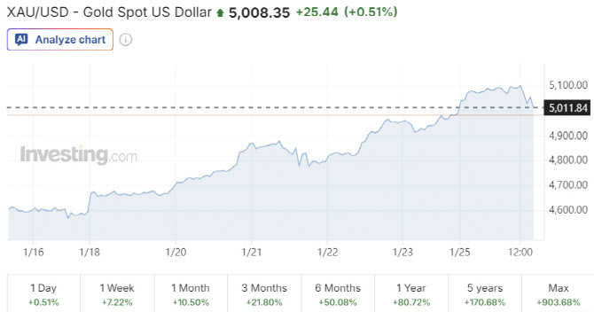 금 가격은 정치·재정 리스크 확대 속에 안전자산 선호가 강화되며 급등했다. 금 현물 가격은 온스당 장중 5100달러를 넘어서며 사상 최고치를 경신했다. 2월 인도분 금 선물 종가는 온스당 5082.50달러로 전 거래일보다 2.1% 상승했다.