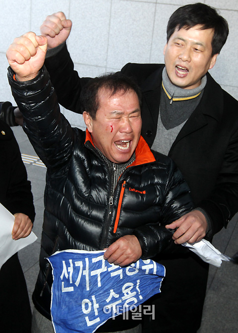 [이데일리 김정욱 기자] 여상규 새누리당 의원과 조유행 하동군수 등이 참석한 가운데 17일 오전 서울 여의도 국회 정론관에서 선거구 확정과 관련 농어촌선거구 통폐합을 반대하는 기자회견이 열렸다. 몇몇 참석자들이 기자회견 후 밖으로 나와 구호를 외치며 시위하고 있다.