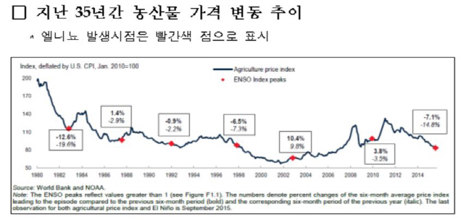그러나 세계은행은 엘니뇨가 국제 농산물 가격에 아직 별다른 영향을 미치지 못하고 있다고 진단했다. 세계은행은 엘니뇨에 따른 기후변화가 시작된 지난 4월부터 9월까지의 농산물 국제가격이 오히려 8~32% 하락했다고 밝혔다.