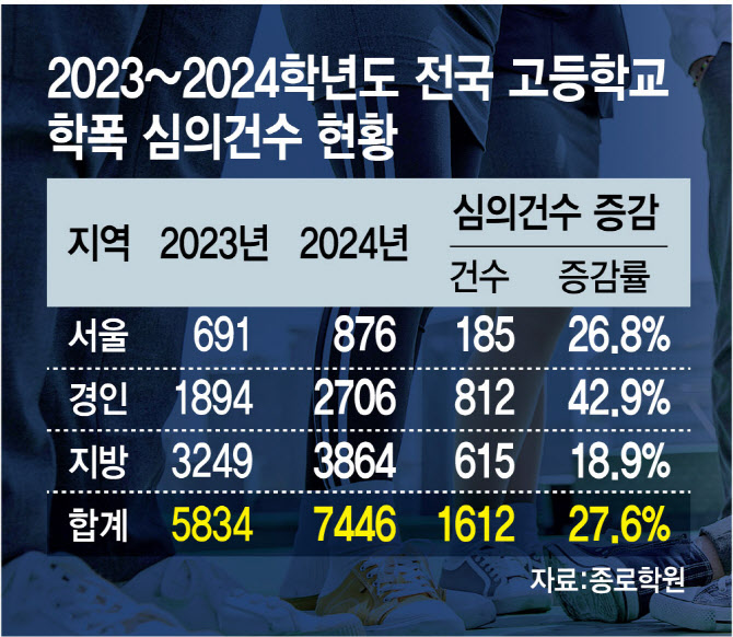 권역별 학폭 심의 건수 증가율은 경기·인천이 42.9%(812건)으로 가장 높았다. 이어 서울권 26.8%(185건), 지방권 18.9%(615건) 순이다.