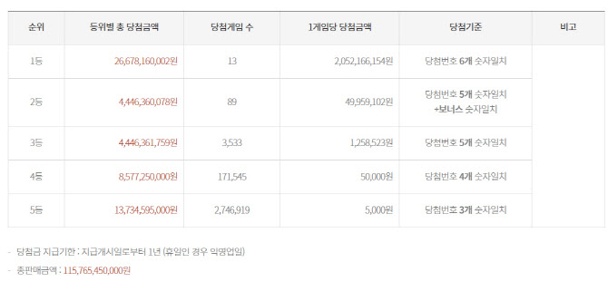 당첨금 지급 기한은 지급 개시일부터 1년 이내다. 당첨금 지급 마지막 날이 휴일이라면 다음 영업일까지 받을 수 있다.