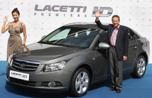 이날 행사에서 릭 라벨 GM대우 부사장(오른쪽)과 인기 탤런트 한은정이 라세티 프리미어 ID모델과 함께 포즈를 취하고 있다.