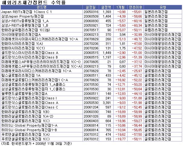 글로벌리츠재간접펀드인 `한화라살 글로벌리츠재간접 1(B)`(-58.9%), `푸르덴셜 글로벌리츠재간접 1(A)`(-57.5%), `골드만삭스 글로벌리츠재간접Class A`(-51.9%) 등을 나타내는 등 대부분이 연초이후 원금의 절반이상을 까먹은 상태다.