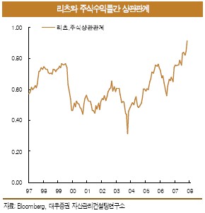 대우증권 분석에 따르면 주식-리츠 자산의 월간수익률 상관관계는 2004년 이후 상승세를 유지해 현재는 0.91에 이르고 있다.