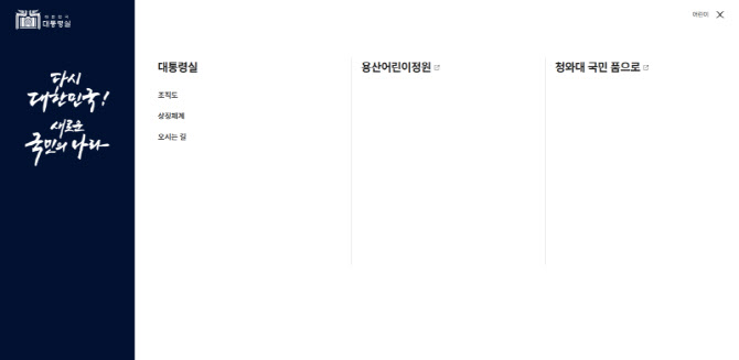 기존 주요 메뉴에는 ‘대한민국 대통령’, ‘대통령실’, ‘국정과제’, ‘대통령실 뉴스룸’, ‘정보공개’ 등 항목과 ‘국민제안’ 바로가기 순서대로 나열돼 있었다.