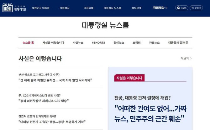 대통령실은 2022년 11월 누리집을 개편하며 상단 메뉴에 ‘대통령실 뉴스룸’을 추가하고 △사실은 이렇습니다 △사진뉴스 △SHORTS(쇼츠) △영상뉴스 △브리핑 △카드뉴스 △대통령의 말과 글 등 7개 세부항목을 운영했지만 이들 모두 사라진 상태다.