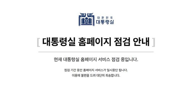 당시 안내 글에는 “현재 대통령실 홈페이지 서비스 점검 중”이라며 “점검 기간 동안 홈페이지 서비스가 일시 중단된다. 이용에 불편을 드려 죄송하다”는 내용이 담겨 있었다.