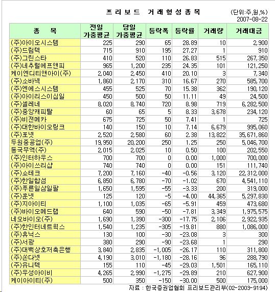 22일 프리보드 지수는 전일대비 0.56포인트(0.06%) 하락한 957.97이었으며, 프리보드 벤처지수는 6.93포인트(0.97%) 상승한 721.07로 마감했다.
