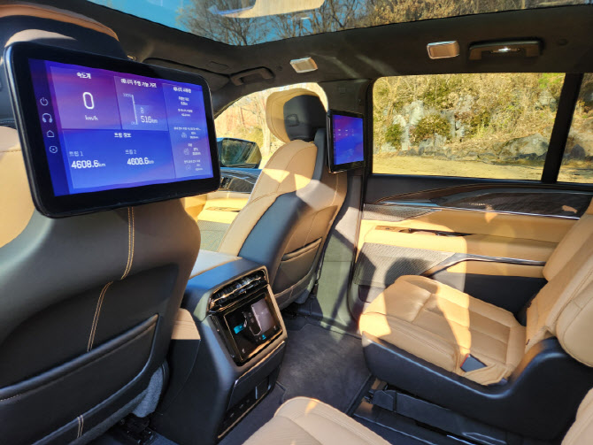 운전석에 앉는 순간 차가 아니라 개인 집무실에 들어온 듯한 느낌을 받는다. 넓은 차폭 덕에 운전석과 조수석이 여유 있게 분리돼 있고, 대시보드·센터콘솔·도어 패널에 촘촘히 적용된 고급 가죽·크롬 소재는 손끝으로 닿는 촉각까지 흡족케 한다. 뒷자석 역시 항공기 비즈니스석에 앉은 듯 공간감과 편안함을 준다.