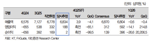 김회재 대신증권 연구원은 2025년 4분기 실적과 관련해 “매출은 6조8000억원으로 전년 동기 대비 4% 증가하고, 영업이익은 1900억원으로 흑자 전환할 것”이라며 “유심 교체 및 고객 보상 비용 일부를 선반영했음에도 경상이익 기준 증익 기조는 유지되고 있다”고 밝혔다. 이어 “유심 교체와 고객 보상 비용을 제외할 경우 4분기 경상이익은 약 4200억원 수준”이라고 덧붙였다.