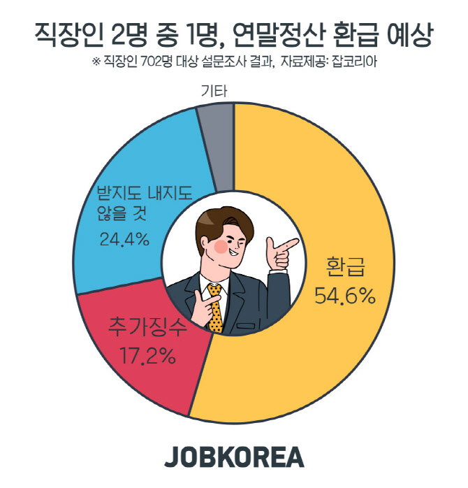 4일 잡코리아에 따르면 직장인 702명을 대상으로 ‘올해 연말정산 결과’에 대해 질문한 결과, 54.6%가 ‘환급 받을 것’이라 답했다.