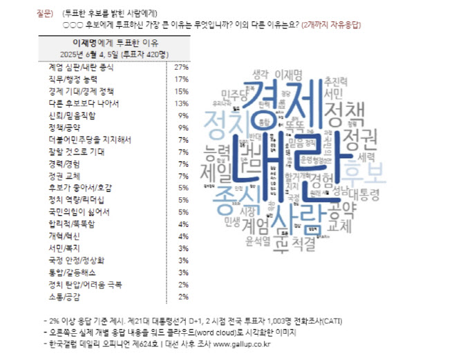 한국갤럽이 지난 4~5일 전국 만 18세 이상 유권자 1003명을 대상으로 조사한 결과(95% 신뢰수준에 표본오차 ±3.1%포인트)에 따르면 이 대통령에게 투표한 사람(420명) 중 27%가 선출 이유로 ‘계엄 심판·내란 종식’을 들었다.