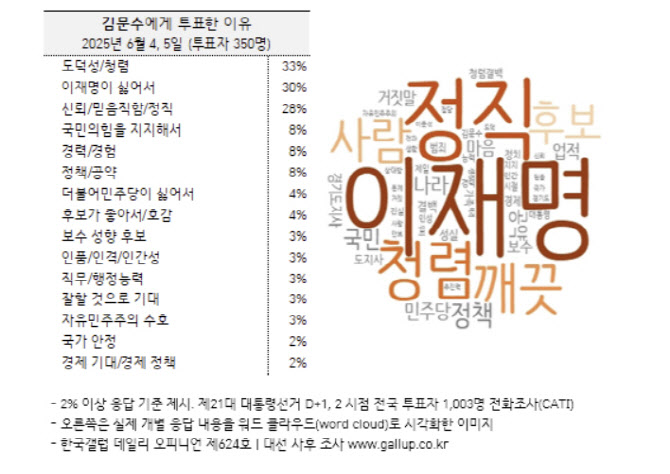반대로 이 대통령에게 투표하지 않은 이들은(430명) ‘사법 리스크·범죄 혐의’(30%)를 가장 큰 이유로 들었다. 2위는 ‘신뢰 부족·거짓말·진실하지 않음’(18%), 3위 ‘도덕성 부족·사리사욕’(14%) 등이 뒤를 이었다. ‘과거 언행·논란’도 6%를 차지했다.