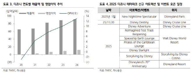 이지수 연구원은 “미국 내 테마파크 입장객 수와 지출 단가 모두 견조한 흐름을 보이며 영업이익이 크게 늘었다”며 “또 부활절 연휴 효과로 4000만달러가 실적에 기여했고, 신규 크루즈선 도입 관련 비용으로 3000만달러가 반영됐다. 중국은 방문자 수는 유지됐으나 지출 단가가 소폭 감소했고, 유럽은 디즈니랜드 파리의 여름 성수기 효과를 누렸다”고 진단했다.