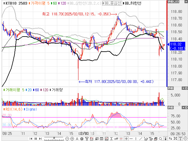 수급별로는 3년 국채선물에서 외국인 2043계약 순매수를, 금투 3359계약 순매도를 보인다. 10년 국채선물에선 외국인 1496계약 순매수를, 금투 2185계약 순매도 중이다.