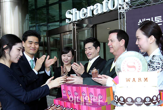 데이비드 커든 호텔 총지배인(오른쪽 두번째)과 직원들이 오픈을 기념해 15일 오전 서울 신도림 `쉐라톤 디큐브시티 호텔` 앞에서 쉐라톤 브랜드를 상징하는 컵케이크를 시민들에게 선물하고 있다.