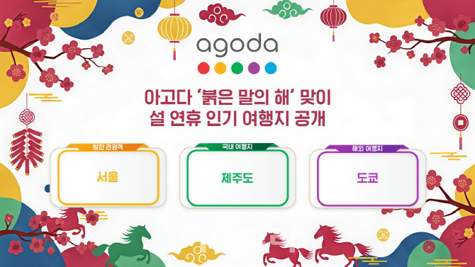 이준환 아고다 동북아시아 대표는 “설 명절을 맞아 아시아 전반에서 여행 수요가 확대되는 가운데, 제주도와 평창처럼 차별화된 경험을 제공하는 국내 여행지에 대한 관심이 높아지고 있다는 점이 인상 깊다”며 “아고다는 항공, 숙소, 액티비티 전반에서 폭넓은 선택지를 통해 여행객들의 설 여행을 지원할 것”이라고 말했다.