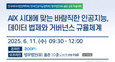 이번 세미나는 새 정부 출범 이후 AI 기반 디지털 대전환을 통해 국가 발전의 전기를 마련하고자 인공지능(AI), 개인정보, ICT 관련 법·정책적 규제 체계 및 거버넌스에 대해 심도 있게 논의하는 자리로 마련됐다. 법무법인 율촌과 한국데이터법정책학회, 한국인공지능법학회가 공동 주최한다.