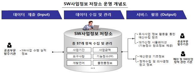 SW사업정보 저장소는 공공부문 SW사업의 예산 수립 및 대가 산정 시 참고할 수 있는 정보를 제공하기 위해 2013년부터 공공 SW사업의 실적 자료를 수집·검증하고, 관련 DB를 구축·운영하고 있다.