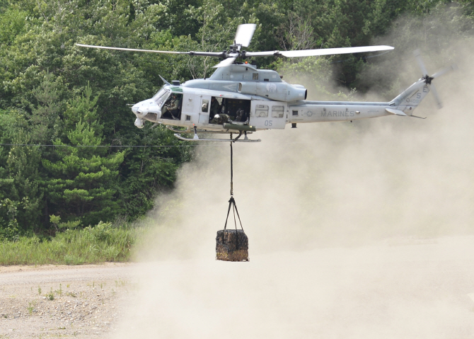 5일 경북 포항에서 진행된 한미 해병대 연합 공지전투훈련에서 미해병대 UH-1H 헬기를 이용해 긴급보급품을 지원하고 있다. (해병대사령부 제공)