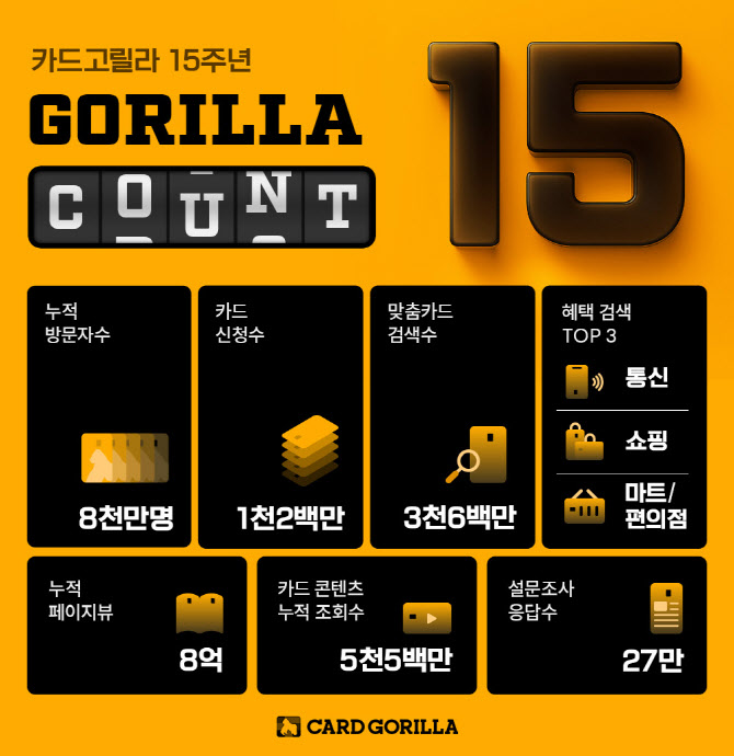 지난 2010년 7월 국내 최초의 신용카드 비교·추천 플랫폼으로 문을 연 카드고릴라는 15년간 꾸준히 카드 관련 정보를 제공하며 국내 최대 신용카드 전문 플랫폼으로 성장했다. 올 6월까지 누적 방문자 수는 약 8000만명, 누적 페이지 뷰는 8억회에 달한다. 지난 1월에는 약 140만 명이 방문해 역대 최다 월간 활성 이용자 수(MAU)를 달성하기도 했다.