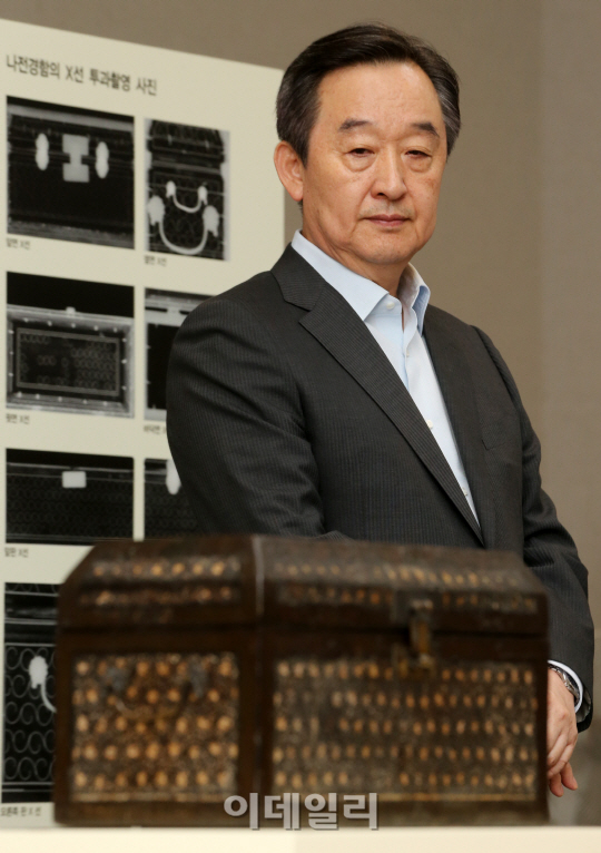 [이데일리 방인권 기자] 신성수 (사)국립중앙박물관회 컬렉션 위원회 위원장이 15일 오전 서울 국립중앙박물관 교육관에서 국보급 문화재 '고려 나전경함'을 살펴보고 있다.