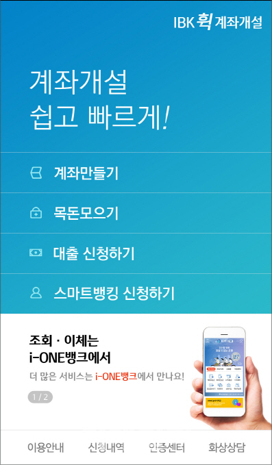 아울러 ‘IBK 휙 계좌개설’ 앱을 설치하면 내달 1일부터 모바일로 신규 계좌를 틀 수 있다. 기존에 있던 비대면 계좌개설 앱 ‘헬로 i-ONE아이원’에 스마트뱅킹과 체크카드 가입 기능을 추가했다.