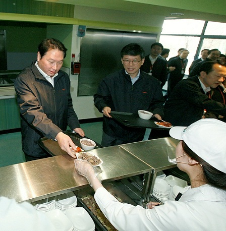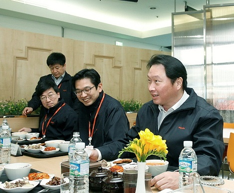 사진은 최 회장이 작업복을 입고 직원들과 함께 구내식당에서 점심식사를 하는 모습.
