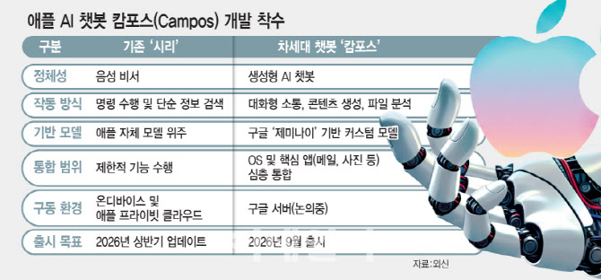 캄포스는 챗GPT, 제미나이와 같은 대화형 AI다. 웹 검색, 콘텐츠 생성, 이미지 생성, 파일 분석 기능을 갖추며 메일·음악·사진·팟캐스트 등 애플의 모든 핵심 애플리케이션(앱)에 통합된다. 현재 시리에는 없는 자연스러운 대화 기능도 지원한다. 애플은 오는 6월 세계개발자회의(WWDC)에서 이 기술을 공개하고 9월 출시할 계획이다.